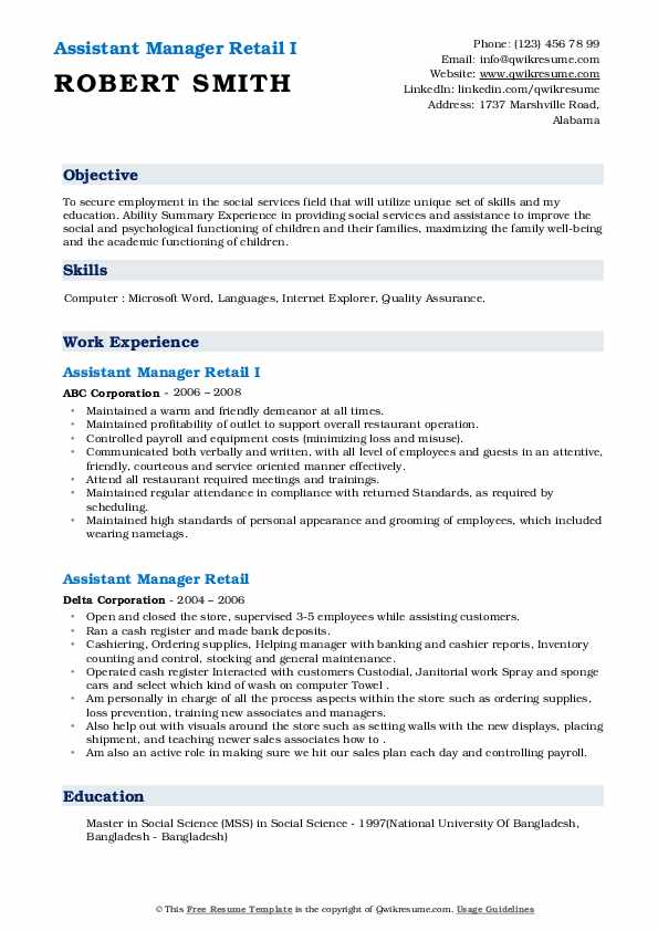 12 Assistant Manager Job Description Templates Free Premium Templates. Getting a job as assistant retail manager can be competitive; The resume examples below will help you create your own resume for a range of retail assistant manager positions. They can also be in charge of the overall day to day smooth running of the store, and for ensuring its profitability. A great resume will give you an edge over many other people that. Check out our assistant manager resume example to learn the best resume writing style. Duties listed on a retail assistant manager resume sample include supervising the sales staff, making sure the store's sales targets are attained, solving for more information on what it takes to be a retail assistant manager, check out our complete retail assistant manager job description. In your resume show that you can. Retail assistant managers are responsible for a variety of tasks, all of which ultimately depend on the size, location and structure of the store they manage. Therefore, the ability to write good resumes is important. Writing a great retail assistant manager resume is an important step in your job search journey. Collaborative skills and ability to work well within a team environment. When writing your resume, be sure to reference the job description and highlight any skills, awards and certifications that match with the requirements. Retail assistant manager resume examples & samples. You may also want to include a headline or. The assistant retail store manager provides assistance to the store manager in the daily operation of the store.